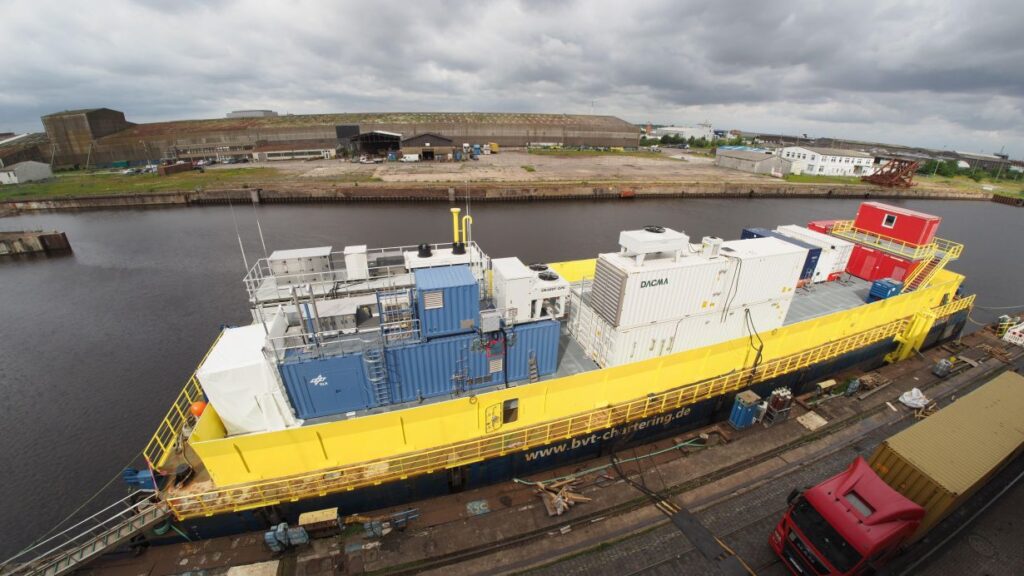 Off-grid, modular, and seaworthy: KIT (Karlsruhe Institute of Technology) and partners intend to produce synthetic fuels on a floating platform using wind energy, seawater, and ambient air. For this purpose, the “PtX-Wind” project was launched under the H2Mare lead project. A corresponding modular plant was installed on a barge and lies operational at anchor in Bremerhaven. Later this year, it will start producing synthetic fuel directly on the sea just off the Helgoland Island.